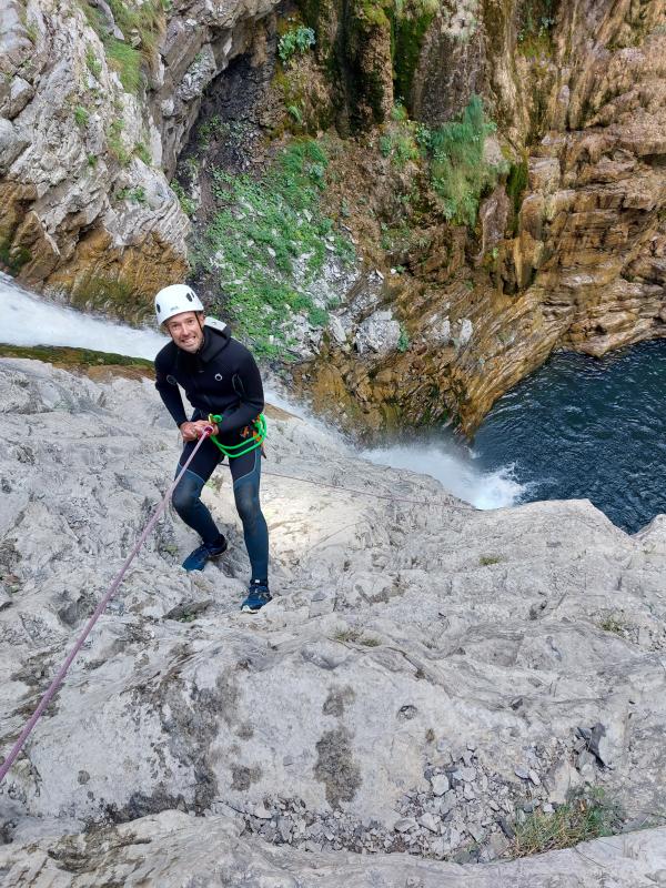 We put on the combis and throw ourselves into the water. Large limestone slabs to begin with, bring us to the first obstacle to cross: a beautiful reminder of fifteen meters (optional).